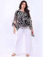 Crafted in Italy by Fashion Boutique UK, this elegant silk top is designed for women who value both comfort and style. Ideal for plus-size figures, it features a flattering lagenlook silhouette that drapes gracefully on all body types. This luxurious tunic showcases a bold swirl print, batwing sleeves, a bay neckline, and a relaxed fit. The double-layer construction adds depth to the design while providing lightweight coverage. Pair it effortlessly with plain silk trousers or denim for a chic look, perfect for casual outings or stylish summer evenings.