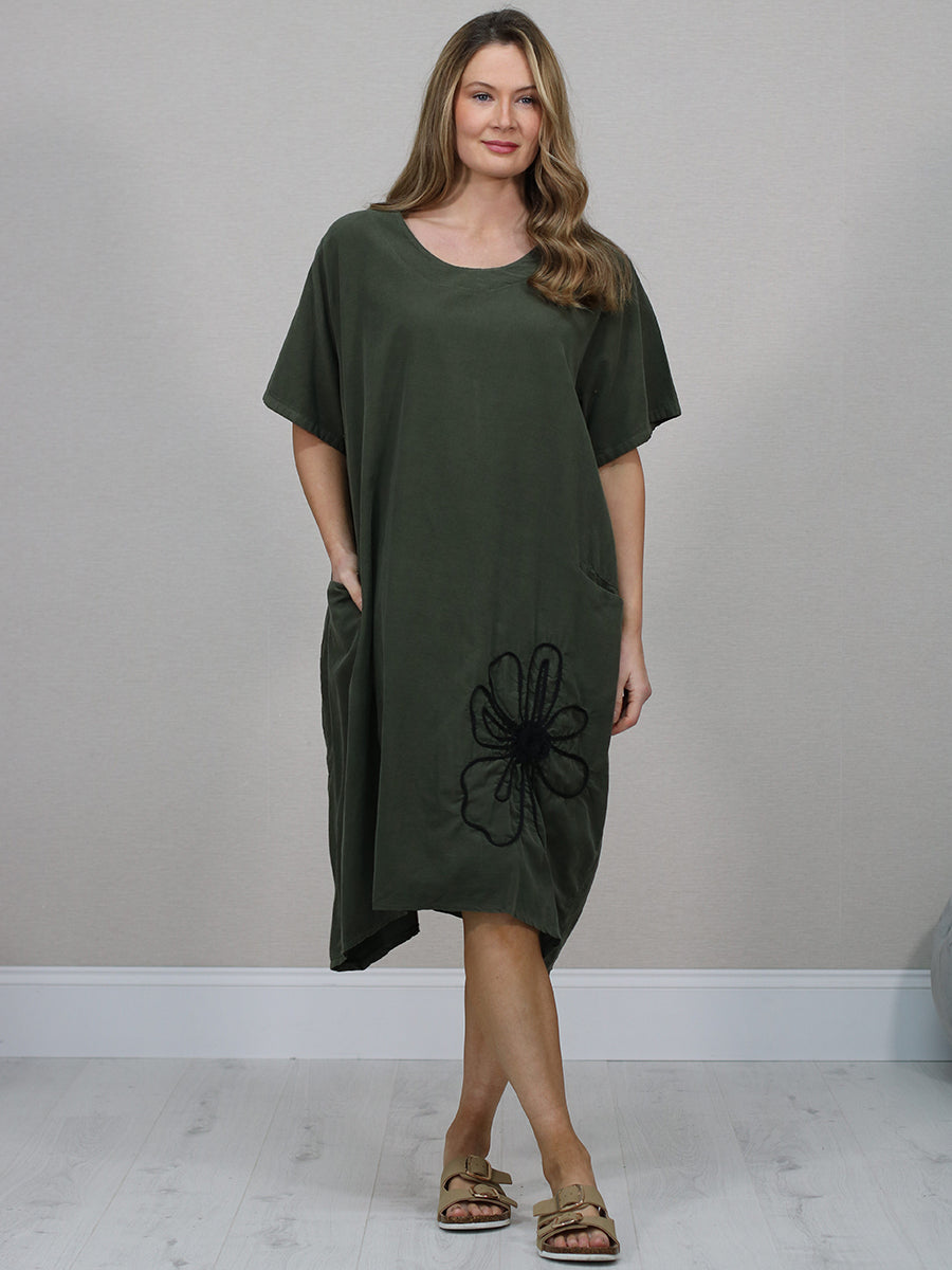 This is a trendy and airy summer dress from Yayavoo Fashion Boutique UK with a flower applique at hem. Made in Italy this cotton dress is enriched with timeless features like classic round neckline, short baggy sleeves, and front pockets that make it even more functional. Pairing up with sandals, it looks comfortable yet stylish for casual days.