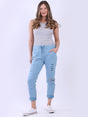 These magic trousers, made in Italy, are playful, stylish, and just bold enough to add a fun twist to your everyday look. The ripped detailing gives it that cool, worn-in vibe, and the little sequin patches add just a touch of sparkle. This is perfect for women who want to feel comfortable while still looking great. The drawstring waist makes it easy to wear all day long. These trousers are perfect for a casual day out or a fun get-together. Just throw on some trainers and an oversized top, and you'll definitely catch some eyes.