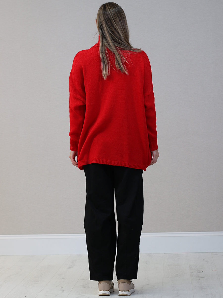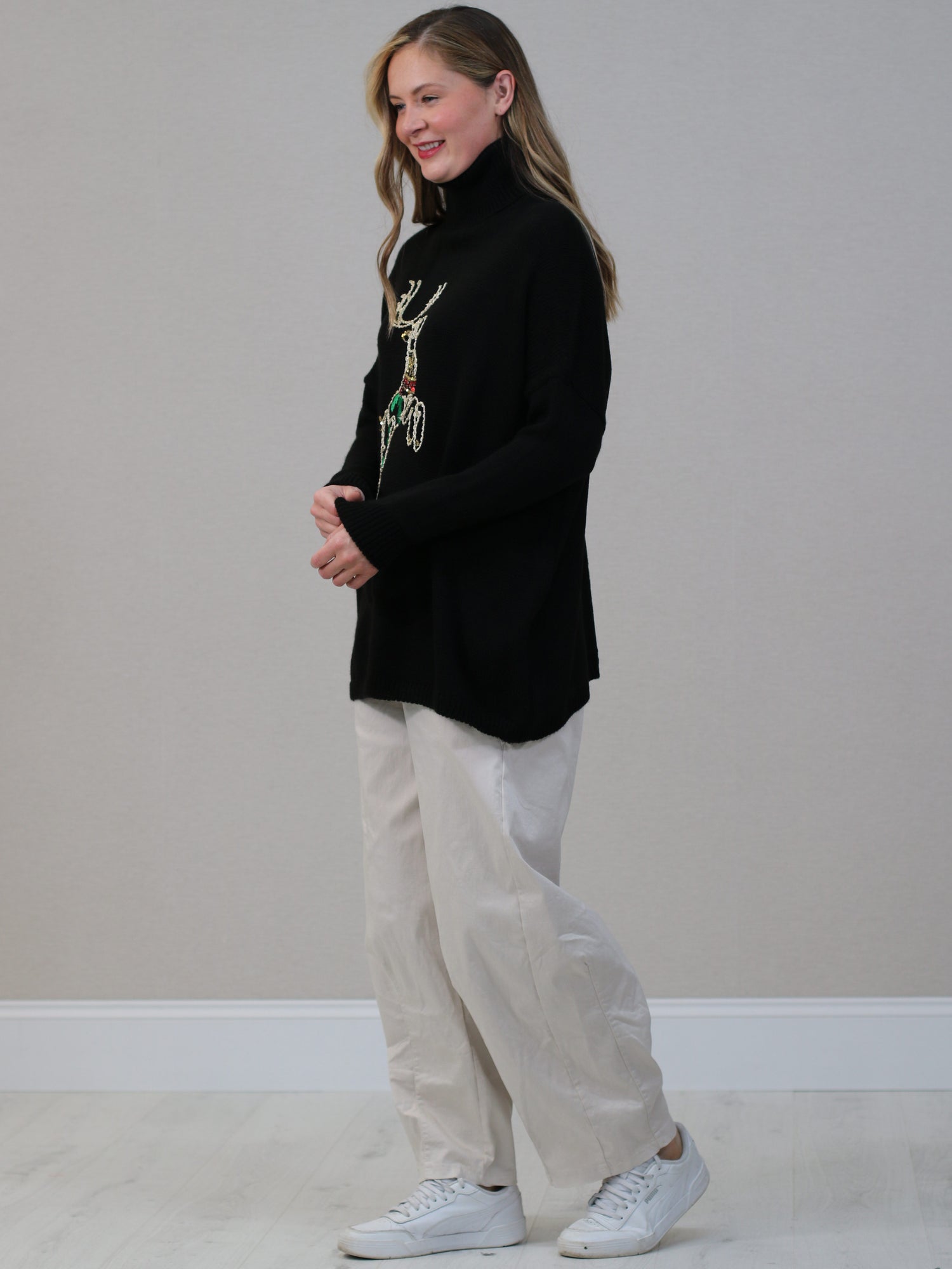 Your ideal travel buddy is this batwing knitted jumper! Its delicate shimmer and lovely reindeer design reflect festive fun. Its soft, warm knit and baggy fit will keep you cosy and fashionable whether your trip is to a holiday party or just embracing the season. This is the best choice to give your winter wardrobe some light-hearted flair.